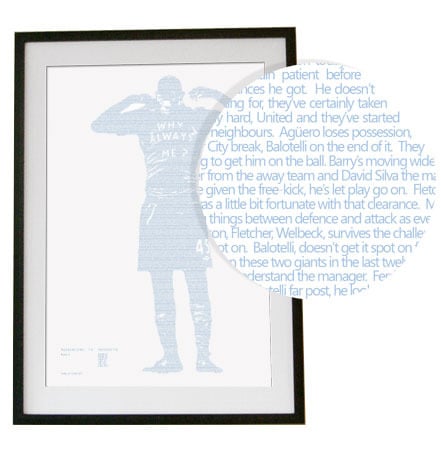 A typographic print of Mario Balotelli, created from the entire transcript of commentary from the 2011/12 Manchester Derby, which City won 1-6.
